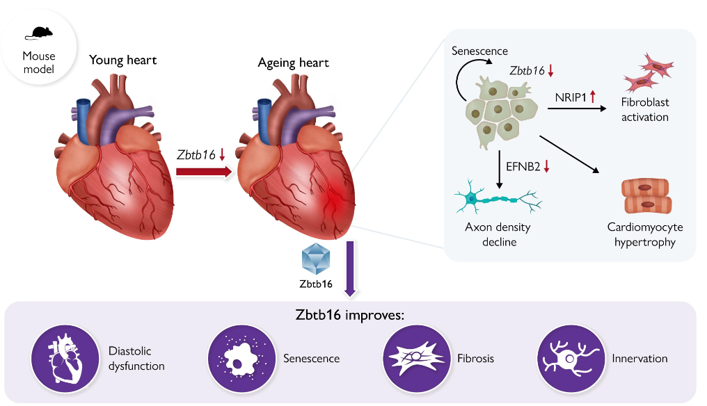 该研究本揭示了内皮细胞依赖性心脏衰老的表观遗传调控机制,并发现含锌指和BTB 域16(ZBTB16)在对抗心脏衰老过程中发挥着关键作用。